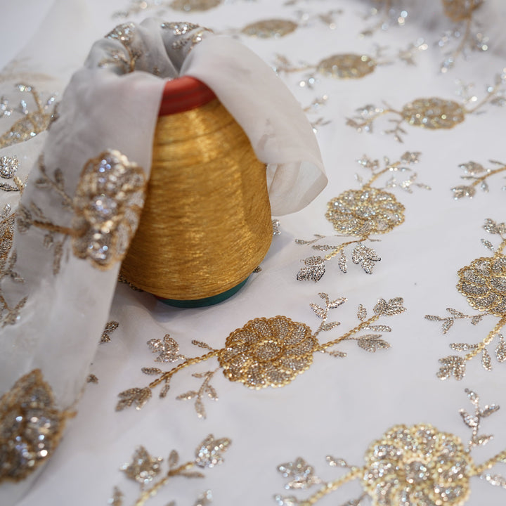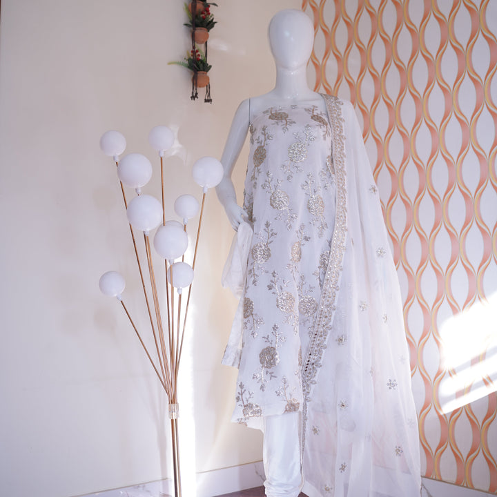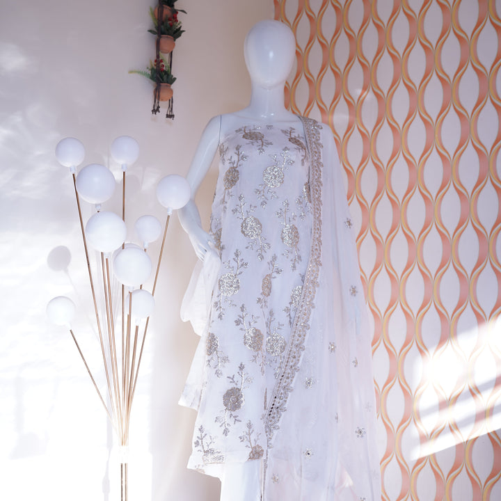 Experience grace like never before with this luxurious embroidered chiffon suit. The soft white chiffon fabric is adorned with intricate silver embroidery, adding a regal charm to your look. The delicate floral patterns shimmer beautifully, making this outfit perfect for special occasions. Paired with a matching embroidered dupatta and classic bottoms, this suit ensures an effortlessly sophisticated appeal.